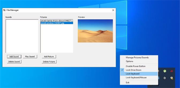 您可以通过"管理图片/声音"选项添加自定义图片或声音。这样,当键盘和鼠标被锁定时,屏幕将显示您选择的图片,并通过声音反馈对按键的操作。