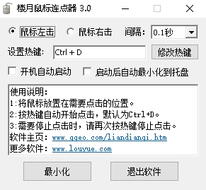 很多同类的软件最小化后都只是最小化到任务栏上,会在任务栏上占用一定的空间。当我们电脑上打开的软件多时,当我们需要将任务栏上最小化的程序激活显示到屏幕上时,该软件将对我们使用电脑产生混淆。好的辅助软件应该是在我们平时不需要它的时候,不会对我们平常使用电脑产生影响,但需要它的时候又可以正常地使用它。楼月鼠标连点器能够最小化到屏幕右下角,当我们不需要它时,甚至都感觉不到它的存在。需要使用其自动点击时,我们不需要将软件界面调出,只需按下相应热键即可自动开始点击。配合上软件开机自动启动的话,软件将在每次开机时自动最小化到屏幕的右下角。并且因为此软件只是一个很小的软件,几乎不占用任何内存,因此对我们平时使用电脑的过程也不会产生丝毫的影响。