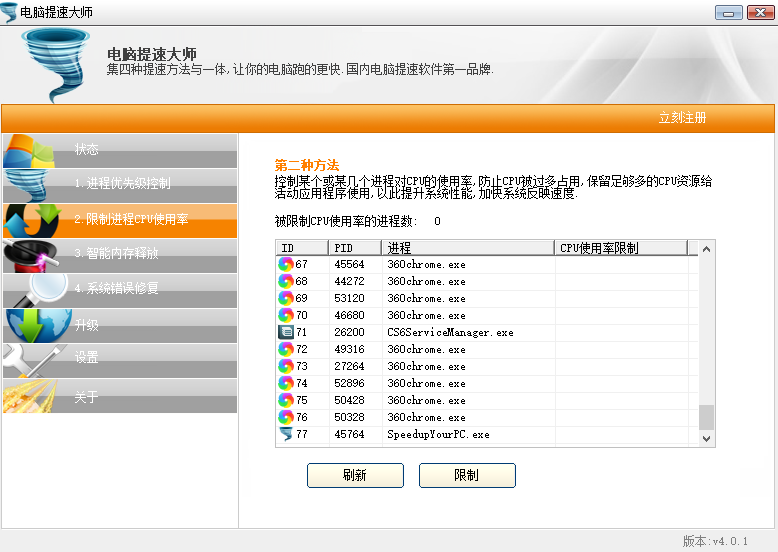 控制进程CPU使用率,防止个别进程CPU使用太高而拖慢电脑整体速度、让电脑变卡。防止变慢,即等于变像的等于给电脑加速