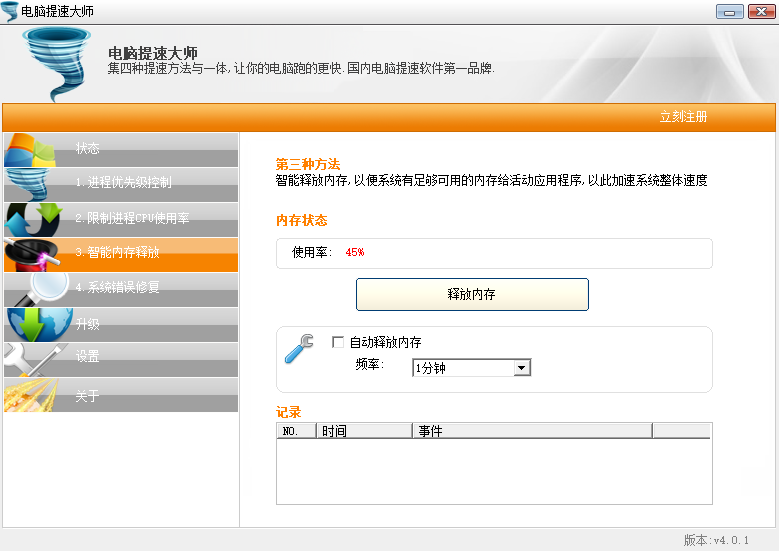 可依照设定的时间间隔或内存占用比率,实时自动释放内存,让电脑有足够的可用内存储备,可用内存量越多,电脑运行越快,以此达到给电脑提速的目的