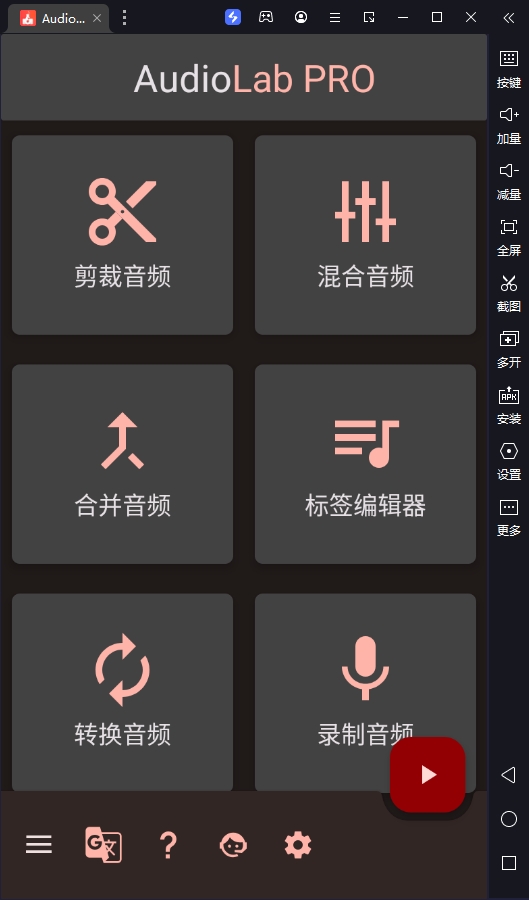 audiolab电脑版是通过安卓模拟器运行的一款专业音频编辑神器,软件的功能非常的强大而且全面,它既可以制作用户自己的专属铃声,非常的有趣,可以按照用户自己的需求来设置。audiolab电脑版还支持自动降噪和手动降噪,您可以手动选择噪音样本范围,进行更精确的降噪,您也可以选择降噪模型进行自动降噪。更重要的是其集音频拼接合成、剪裁音频、视频转音频、标签编辑器、转换音频、变音、变速、变调、录制音频、声道的合成等等数十种专业功能模式于一体,致力全方位满足用户对音频处理的使用需求。