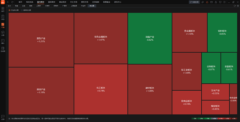 热力图板块面积与沉淀资金数额成正比,沉淀资金数额越大,则对应板块的面积越大。板块颜色与对应的涨跌幅相关,涨跌幅度越大,则对应板块的颜色越深,具体颜色与涨跌幅的对应关系可通过热力图右下角的颜色标尺查看。