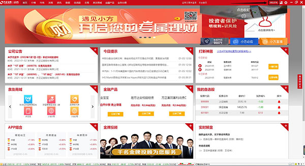 小方证券电脑版是一款全功能、全景资讯、智能分析的行情交易PC客户端,它可以让投资者在电脑上随时随地查看股票行情,进行安全交易,堪称是新一代移动理财神器。同时该软件还支持个股分时、K线等详细指标,并支持普通交易、融资融券、基金、银证转账、理财产品购买、投资顾问收益一览表等业务,可以让投资者可以更好的把握瞬间行情,提供全方位专业便捷的金融服务。
