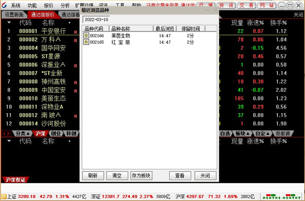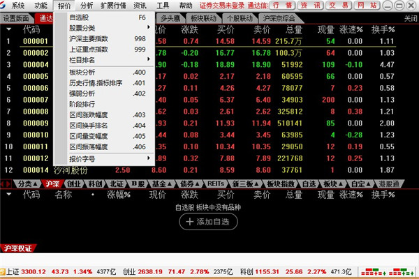 3、报价分析是通过不同的分类选股方式,以报表的形式列出商品的实时报价。您可以查阅:自选股报价、分类股报价、板块股报价和商品顺序报价(上证、深证)。