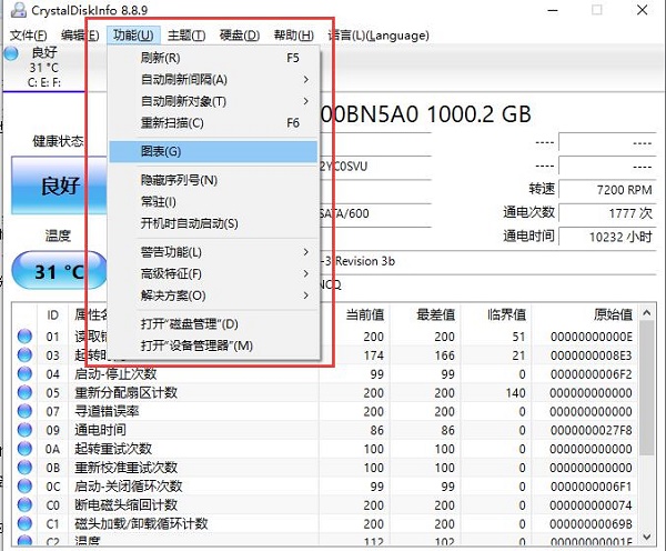 2、点击【功能】——【图表】,在这里crystaldiskinfo以下拉菜单的方式将我们硬盘的各种相关信息以图表状的方式清晰的呈现在我们眼前。