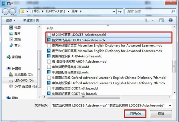 3、按住 CRTL键同时选择一部词典的mdd文件和mdx文件,点击“打开” (注意mdd和mdx这两个文件的文件名必须保持一致)