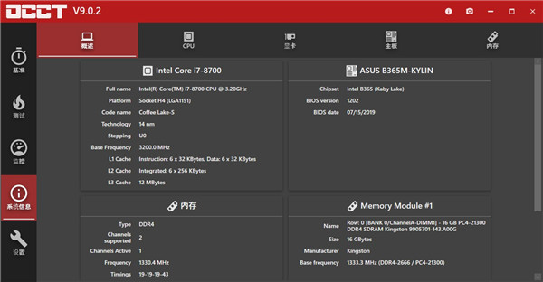 2、在其主窗口中,OCCT 显示有关硬件设备的详细信息,例如CPU和主板。此外,还有一个表格,您可以在其中查看当前和超频的CPU和总线频率。