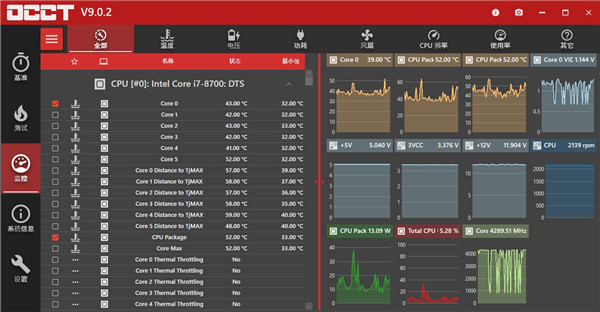 OCCT电脑版将监控您的计算机并向您显示实时图表,显示测试期间的温度,电压,风扇速度,频率,组件使用情况和功耗。