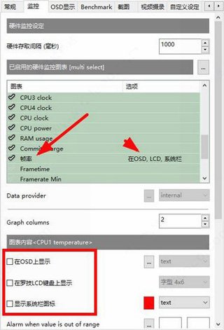2、然后在【监控】标签下,找到cpu选项,先点击做左侧,将√打起来,然后将在系统栏,osd等项目前的√也打上