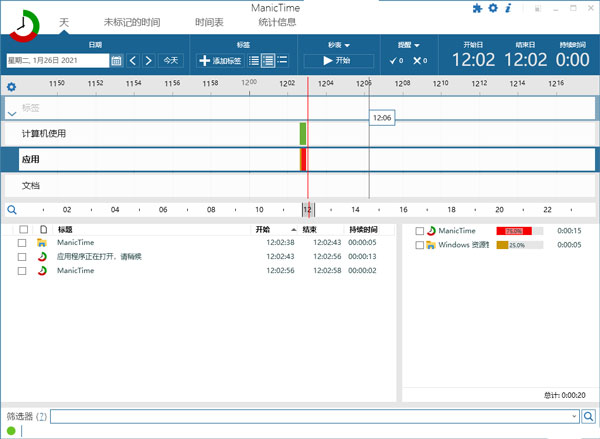 您甚至还可以使用他来查看到你某个网页的使用时间哦,并且将您处理过哪些文档等等数据都详细的记录下来,非常的强大。ManicTime不会占用你很大的内存,它会在后台静默的运行,不会影响你电脑的当前的任何工作,当您需要查看数据是打开即可查看,软件的界面也是非常的简洁明了,由时间轴和统计明细组成,时间轴的分类方式主要是根据活动内容来的,分为标签、计算机应用、应用程序和文档。