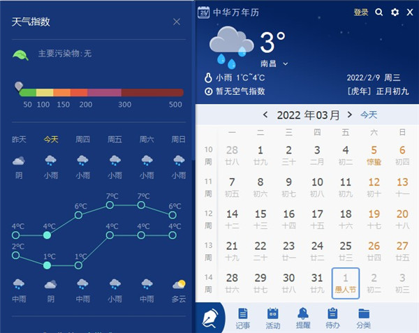 答:天气插件分为5块,点击右上角可以进入中华万年历闹钟界面;点击左上角可以进入天气界面;点击左下角可进入日视图;点击右下角可快速添加云记事、活动、提醒等;点击插件中心部分可以自定义设置快捷方式。