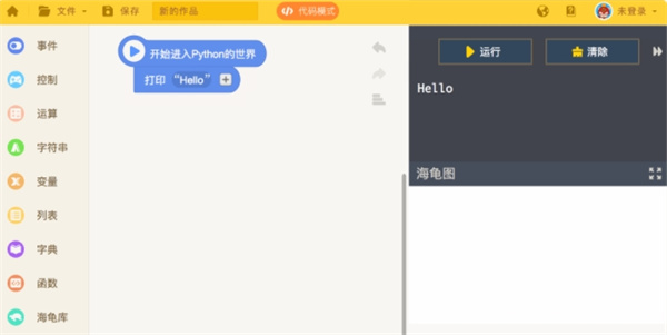 3、从海龟库积木盒拖出积木,点击“运行”,一键绘图。