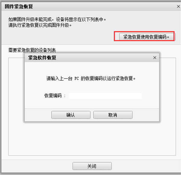 3、我们进入到紧急固件恢复界面,然后我们点击紧急恢复,此时会产生一个恢复编码(如果您想在另外一台电脑上进行紧急固件恢复,请务必记住此编码),然后我们选择恢复,等待固件紧急恢复完成即可。