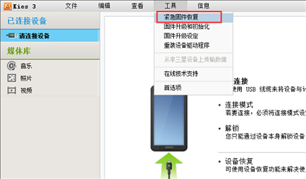 2、接下来我们进入到samsung kies 3软件主界面,如下图所示,我们点击界面上方的“工具”选项,然后在下拉的菜单栏中点击“紧急固件恢复”选项,进入下一步。