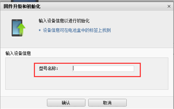 2、我们进入到固件升级和初始化界面,如下图所示,我们需要输入设备信息,这个设备信息可以从电池盒中的标签上找到,我们找到后再选框中填写上。然后进行下一步。