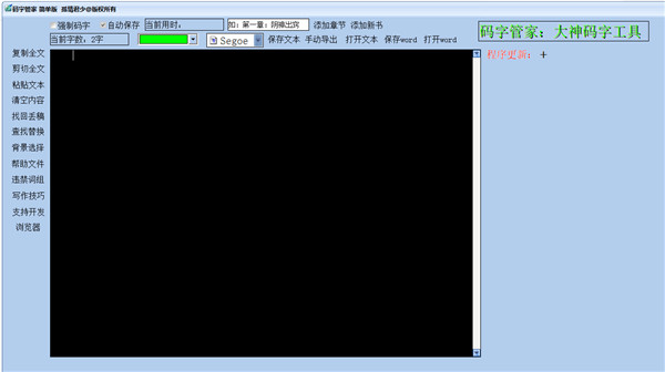 1、码字管家是绿色版,无需安装。双击即可运行。2、进入主界面后,可以看到界面非常的简洁直观。拥有非常多丰富的功能。