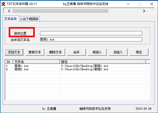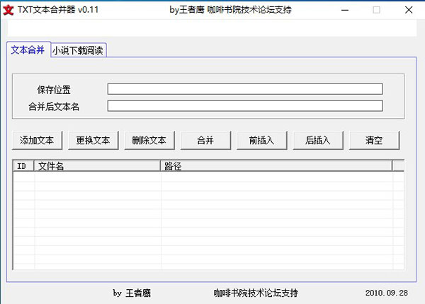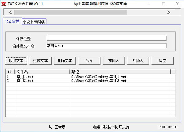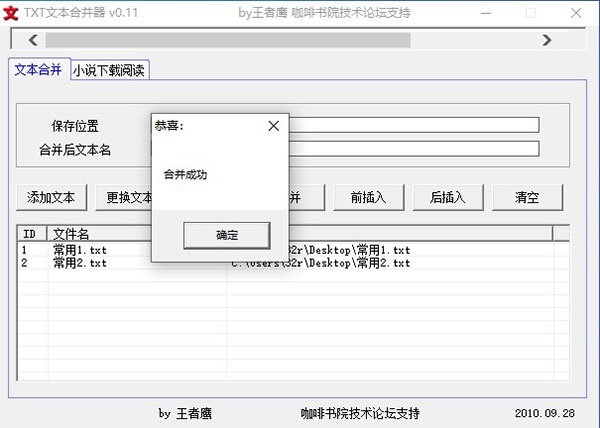 这款txt文本合并器真是个宝藏工具,特别适合我这种喜欢在手机上看小说的人。网络上的小说经常是一个章节一个章节的,看得零零散散特别不过瘾,有了这个软件就能把它们全部整合到一起,阅读体验瞬间提升。它完全免费,还是绿色版,解压就能用,非常方便。虽然它是由易语言编写的,可能会被某些杀毒软件误报,但只要添加信任就没问题了。操作起来也特别简单,先添加想要合并的文本文件,设置好保存路径,然后点击合并,稍等片刻就能得到一个完整的文档。对我来说,这解决了大麻烦,再也不用在手机里翻找多个文件了,真心推荐给爱看书的朋友们。 注意事项 1、txt文本合并器由易语言编写,如果报毒,纯属杀毒软件误报,添加信任即可使用。 使用教程 1、首先我们点击“添加文本”按钮,然后选择想要合并的文件 2、点击保存位置,设置合并成功后的文本存放的路径 3、然后点击“合并”,等待数秒(根据文本内容、大小决定速度因素),软件提示“合并成功”之后,点击“确定”