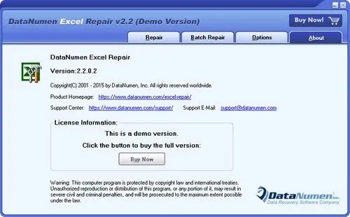DataNumen Excel Repair是一款来自国外的可以修复excel的工具,DataNumen Excel Repair软件是国外引进的,所以功能方面要稳定得多,比一般国内的修复程序要好,支持修复损坏的Excel xls和xlsx文件,它可以扫描损坏的文件并尽可能多地恢复数据,以减少文件损坏的损失。DEXCELR支持在Excel v3/4/5/95/97/2000/XP/2003/2007/2010/2013格式中恢复文件。此外,它与Windows资源管理器集成,支持拖放操作和命令行参数,这将使您轻松快速地修复文件。据说它的修复成功率能有78.73%,修复率是最高的,唯一不足的地方可能就是软件没有中文版,主界面是英文的,这个对于一般朋友来说可能会有操作上的困难,但是官方也提供了一个说明文档,您可以参考软件的说明以及功能修复自己损坏的Excel文件;DataNumen Excel Repair修复的范围非常大,支持Excel2000到2013等进十个版本,并且可以设置内部的缓存数据,尽可能以最大的速度修复你的Excel文件!本站提供的DataNumen Excel Repair安全、无病毒、无恶意代码,请放心使用!
