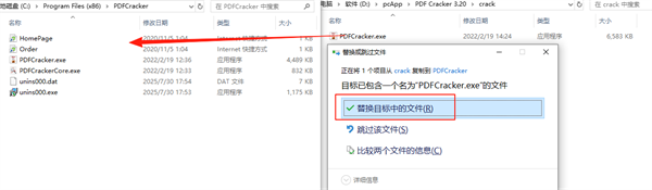 10、将复制的”PDFCracker.exe“文件,粘贴到打开的文件夹中,在点击“替换目标中的文件”,这样你就可以无时间限制的使用该软件了!
