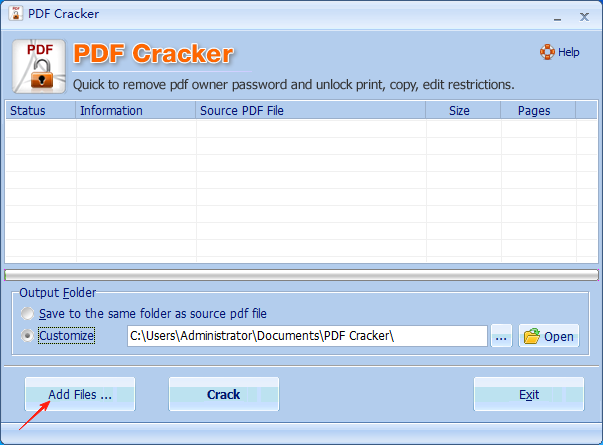 1、打开PDF Cracker,点击“Add Files”添加需要解锁的PDF,或者直接拖拽需要解锁的PDF。