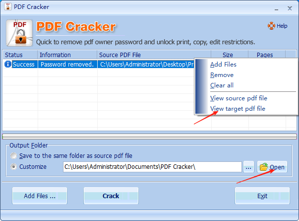 4、鼠标右键,然后点击“View target pdf file”,就可以直接查看解密后的PDF了,可以点击“Open”打开解密后PDF的位置进行查看。