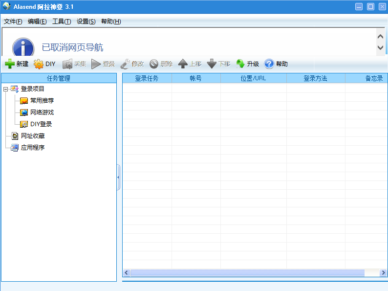 登陆几乎任何邮箱、博客、论坛类注册网站,阿拉神登帮我们在IE上采集保存我们的帐号密码信息,四种简单的方式便可新建各种登陆任务,实现完美一键登陆,DIY采集,直通登陆、自动填写,简捷保存、提示登陆、热键登陆等各种操作,方便我们 一键登陆各种网站。
