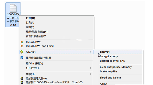 AxCrypt 的使用十分简单,安装完成后,鼠标右键点击要需加密的文件,就会出现 AxCrypt 的选项,点击“Encrypt”即可给文件加密了。如果希望加密之后的文件可以在未安装 AxCrypt 的机器上使用的话,可以选择“Encrypt copy to .EXE”(加密成.exe文件) 就可以了。