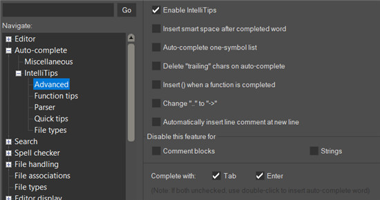 我们以自动完成对话框为主题,并扩展了常规自动完成功能,以提供对自动完成建议的更精细控制。您可以配置是否在此处显示IntelliTips,语言关键字和/或活动文件中的文本,以及何时提出建议以及如何处理不同情况