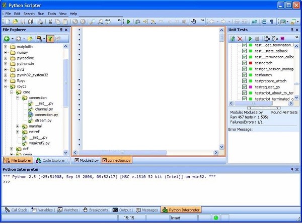 它显示了一个用户友好的界面,隐藏了大量的功能,并为您提供语法高亮编辑器,集成的Python解释器和调试,以及编辑器视图和代码探索。该应用程序非常简单,其设计与其他与Python一起使用的编码工具类似。您可以重新排列组成应用程序的窗口或使它们浮动。PyScripter授予您使用文件,代码和项目资源管理器窗口,以及交互式解释器和消息窗口。