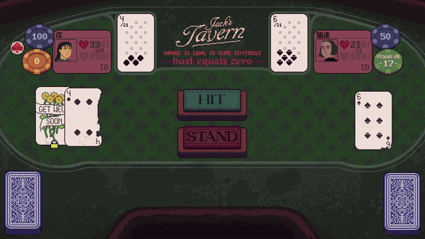 3、玩家需与NPC进行比赛,通过叫牌来抓取扑克牌,最接近21点的玩家则获胜,超过21点则自动爆牌输掉比赛,对手爆牌则攻击对手与自己卡牌点数相同的血量,双方均无爆牌则以差值攻击输掉的玩家。