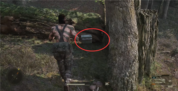 2、这里有让玩家去拿回自己的背包,先去左右两侧搜刮下物资,然后再回到中间,到树干对面去。