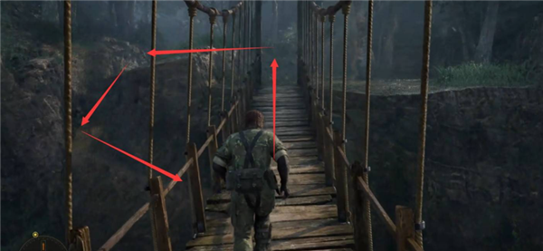 12、桥上若有敌人,可以在桥上悬挂潜行穿越。过桥后,注意桥头左侧的下方洞穴,里面可拾取【XM16E1突击步枪】和药物。