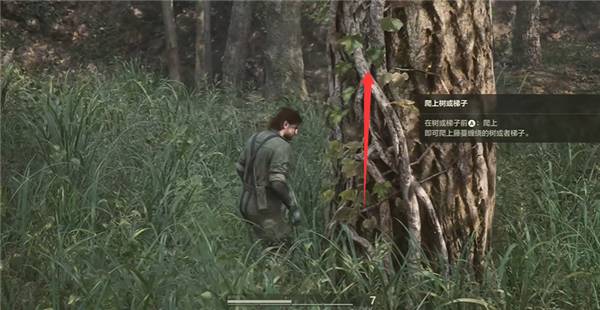 3、过来后往前,这里靠近会有爬上树或梯子的提示,爬到树上就能拿到悬挂在树枝上的背包。