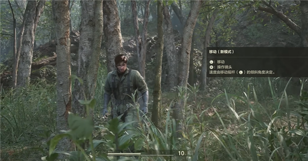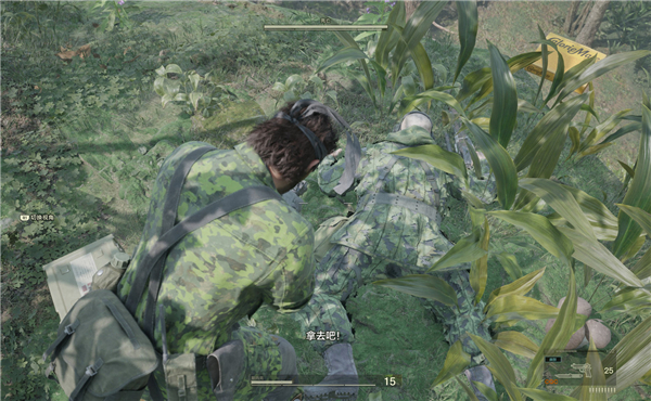 4、这里会有剧情,告诉玩家要拿回背包就可以使用武器了。剧情结束先别急着探索,先调整一下伪装,选择数值高的迷彩服和脸部油彩。血条右边会显示伪装值,数字越大越好。