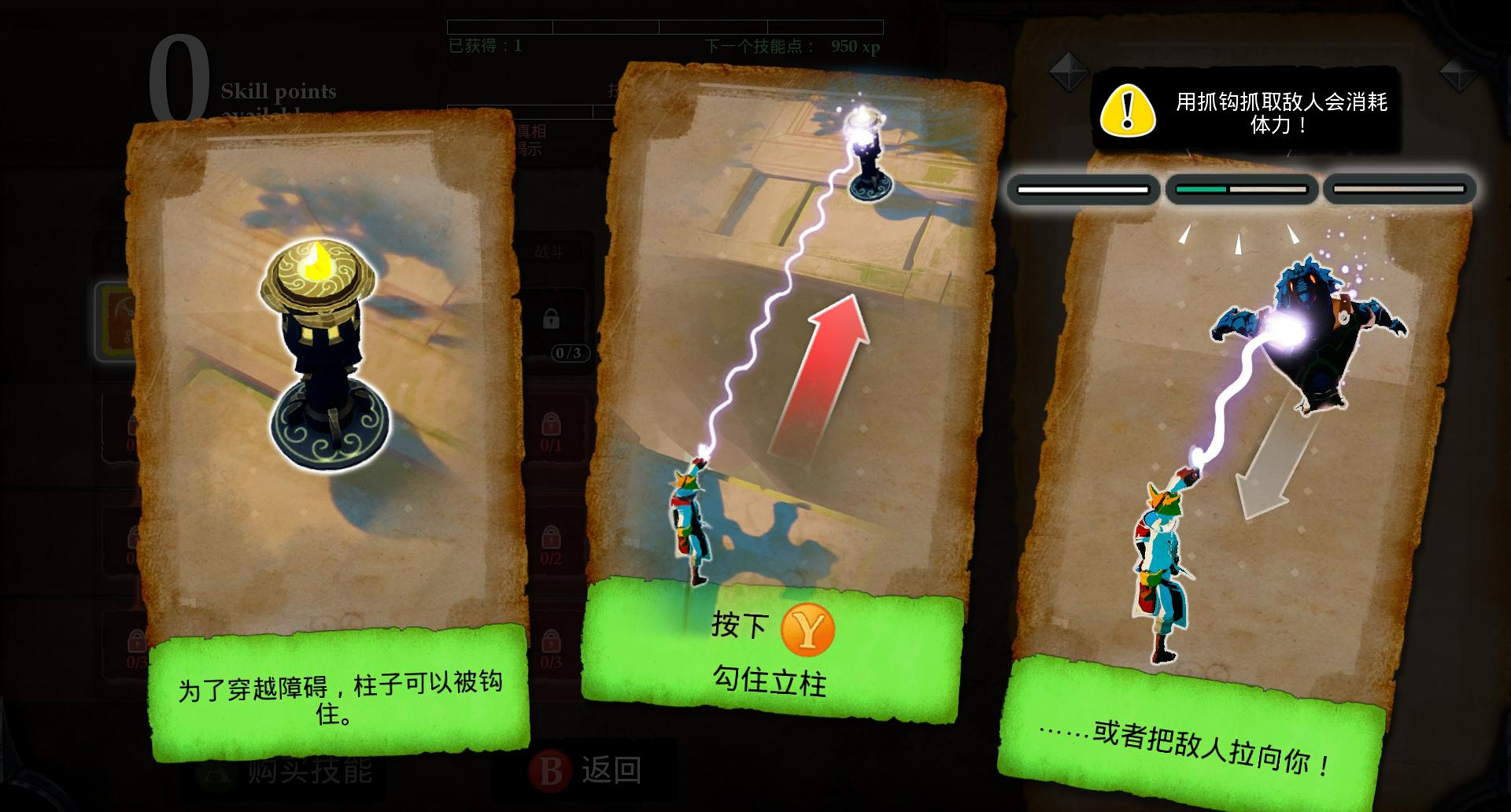 step3.彼得站在一个平台上,先击杀后面追上来的乌鸦,这时候雷纳多就可以升级,找到一个祭坛进行升级,学会爪钩的技能。