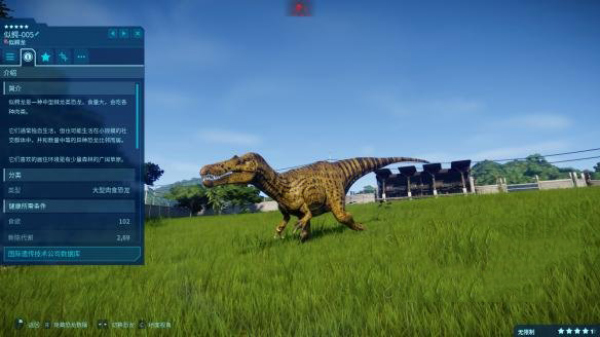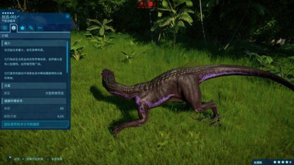 电影第二部的混种龙,狂讯已经不能被称之为恐龙了,流线型身材,中等大小,是被设计出的兵器,游戏中唯一拥有特定击杀特效的存在,饲养需求苛刻,空间中等偏大。
