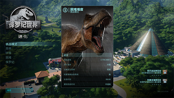 6、挑战模式一共分为简单、中等、困难以及侏罗纪四种模式,且任意难度达到五星后即可解锁恐爪龙丛林花纹皮肤,另外侏罗纪难度达到五星后还可解锁狂暴龙海岸花纹皮肤