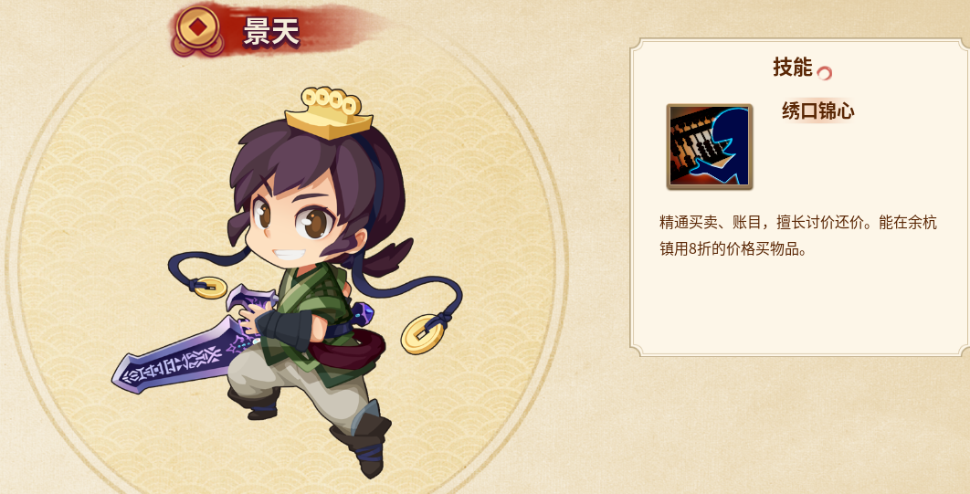 技能效果:精通买卖、账目,擅长讨价还价。能在余杭镇用8折的价格买物品