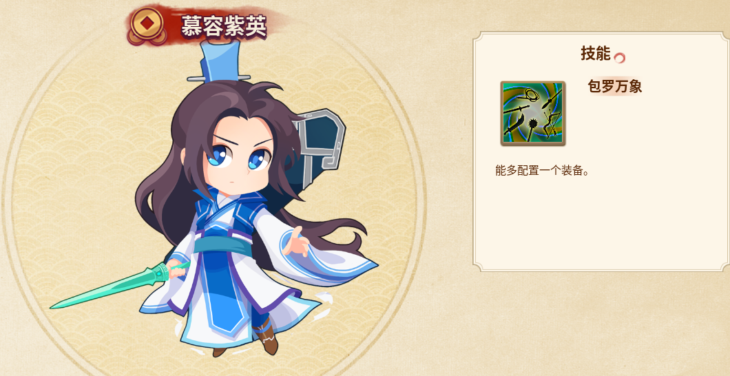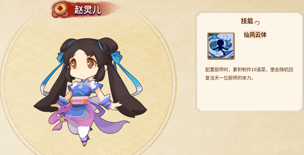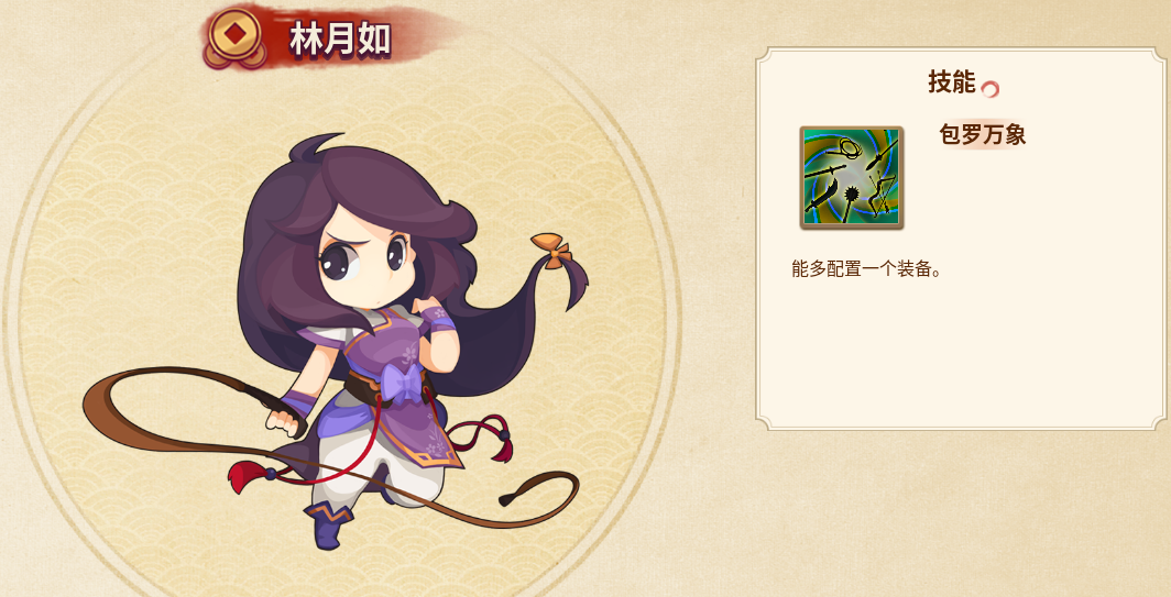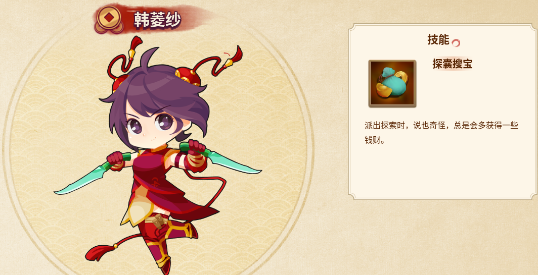 技能效果:凭着可爱的外表,善良的心地,受众人喜欢;派去余杭镇,跟商人聊天,能多得到一份小礼物。