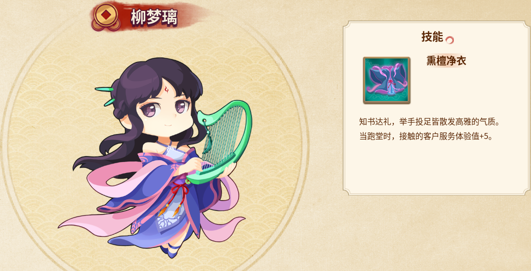 技能效果:知书达礼,举手投足皆散发高雅的气质。当跑堂时,接触的客户服务体验值+5