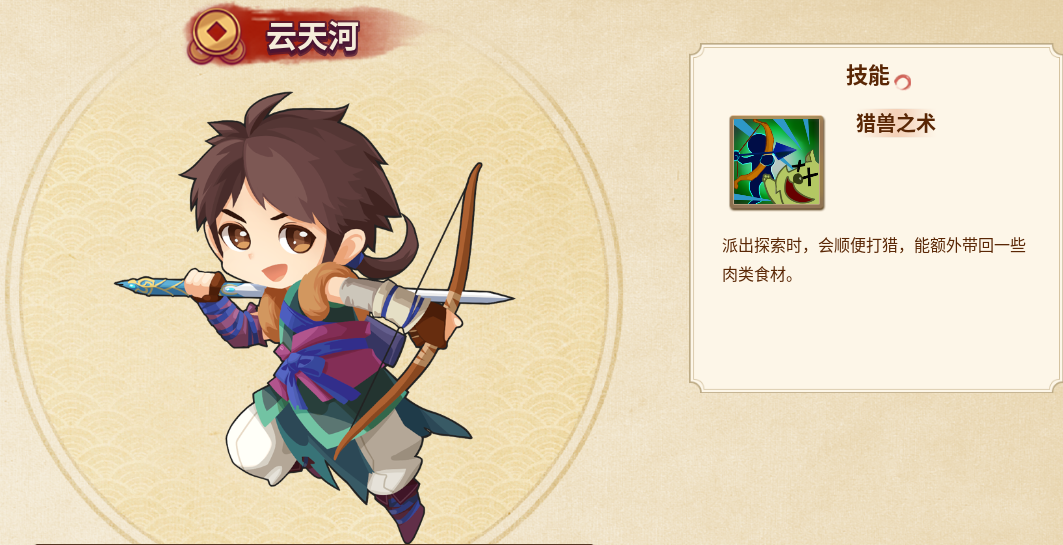 技能效果:派出探索时,会顺便打猎,能额外带回一些肉类食材