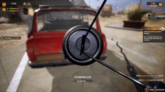 二手车销售员都不诚实,为什么加油站的经营者必须诚实呢?赚钱很费时间,有时你得到的报酬比你应得的少得多。这就是为什么我们为那些不愿意等待发财的狡猾玩家设置了这个选项——撬锁。你可以选择几乎任何一辆车,走到后备箱,然后试着打锁。我们提供了三种难度——简单,中等和大师。没错,每一个都比另一个更难。