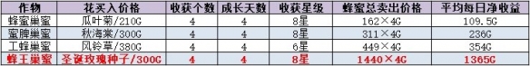 二十个蜂箱每四天可以产八十个蜂王巢蜜,加工后卖出,一次可以赚到126800G!而成本不过是6000G而已,相当于一天的净收入就达到了30200