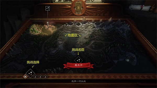 此界面包含中间的地图区,下方的挑战选择及挑战的名字。