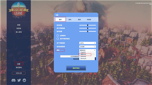 3、进入游戏后默认为简体中文,点击设置-偏好-语言,可以更改游戏语言。