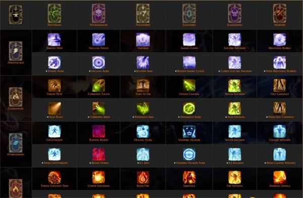 左列技能为电、土、冰、火,右行技能分别为追猎、死灵、变形、盗贼、召唤、战士。两两技能书(非空白的技能书)组合如下,带蓝点的是源力技能书,需要两本中至少一本是源力技能书才能合成。
