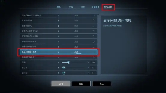3、点击设置中的【游戏设置】选项(见下图),然后找到并点击启用【显示网络统计信息】;