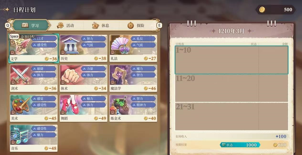 3、合理安排女儿的日程是游戏关键。日程选项通常包括学习、工作、休息、娱乐等。学习不同课程可提升相应属性,如学习魔法可增加魔力属性。