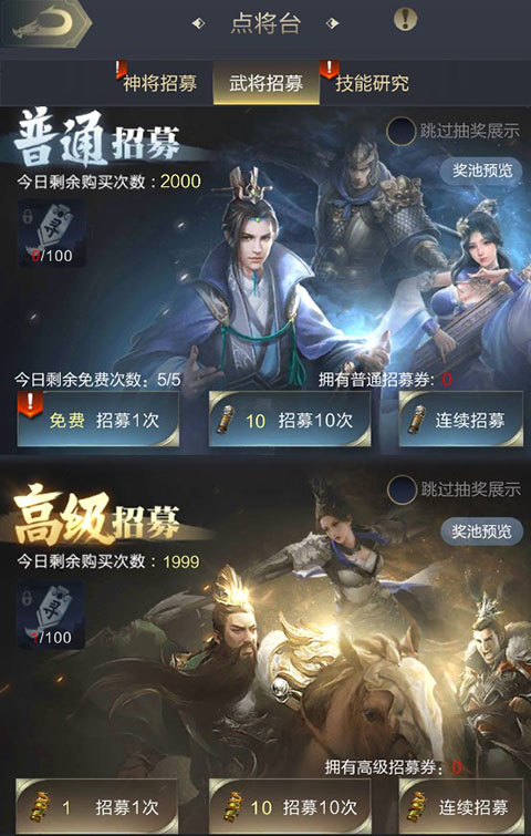 1、点将台招募是获取武将最直接的方式,有普通、高级两种招募方式。