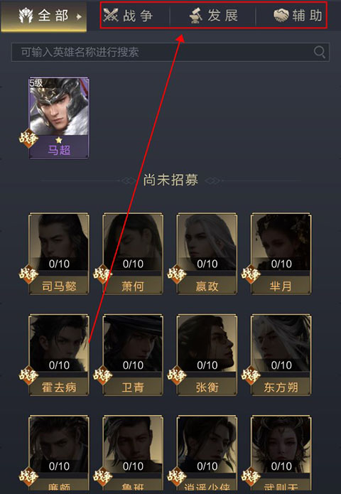 1、游戏内的武将分为战争、发展、辅助三种类型,每种类型武将都有专属发展方向。